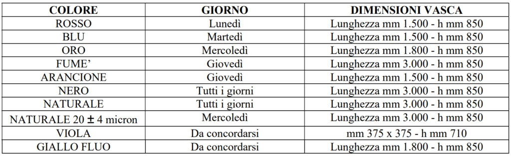 Il materiale da sottoporre ad anodizzazione (con esclusione delle colorazioni nero e naturale) dovrà pervenire nel nostro stabilimento di Modena entro la mattina del giorno precedente a quello previsto per la lavorazione. Si precisa che il calendario di lavorazione potrà subire variazioni o slittamenti in caso di sopravvenute esigenze aziendali. L’ossidazione anodica a colore sarà pertanto programmata con cadenza settimanale come segue: